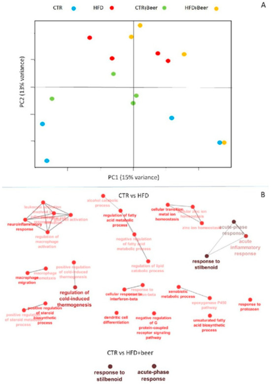 (A) Principal Component Analysis (PCA) of 20,117 transcripts with at least 1 count for 100,000 reads in at least 3 samples. The groups are identified as follows: CTR in blue, CTR+beer in green, HFD in red, HFD+beer in yellow. (B) ClueGO Gene Ontology GO analysis to compare (A) 162 DEGs for CTR vs. HFD and (B) 43 DEGs for CTR vs. HFD+beer.