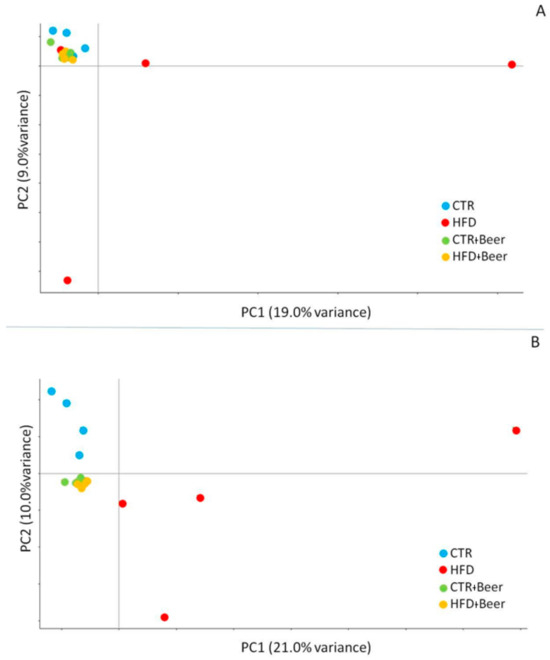 Principal Component Analysis (PCA) of CpG methylation level for (A) 509,561 cytosines in CpG context with al test 10X coverage were identified in all samples and (B) a subset of 74,993 cytosines in the CpG context with highest inter-group variability. The groups are identified as follows: CTR in blue, CTR+beer in green, HFD in red, HFD+beer in yellow.
