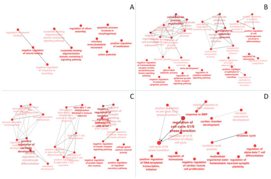 ClueGO Gene Ontology GO analysis for comparisons between (A) 230 DMGs for CTRvsHFD and (B) 175 DMGs for CTRvsHFD+beer, (C) 201 DMGs for CTRvsCTR+beer, (D) and 257 DMGs for HFDvsHFD+beer.
