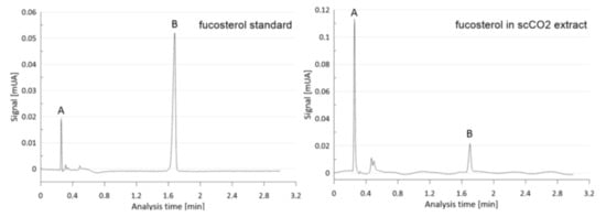 SFC chromatogram (UPC2 system) of the Fucus vesiculosus scCO2 extract (fucosterol standard on the left, extract on the right) with A–solvent; B–fucosterol.