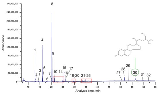 The GC/MS analysis revealed the presence of fatty acids and fucosterol in Fucus vesiculosus scCO2 extract. The obtained mass spectra for each compound was compared with the NIST library. Based on GC/MS analysis, saturated fatty acids were distinguished from unsaturated ones by the absence of the fragment ions of 74, 87, and 143, in mass spectrum in the case of the latter. Fatty acids 14:0 (1), 16:0 (4), 18:0 (7) and 20:0 (13) were characterized by the molecular ion m/z 242, m/z 270, m/z 298 and m/z 326, respectively, with the characteristic fragment ion of m/z 211, m/z 239, m/z 267, and m/z 295, respectively, as the effect of methoxy group loss [M-31]+, confirming that the form of fatty acids was that of methyl esters. In turn, fatty acids 18:1n-9 (8), 18:2n-6 (9), and 18:3n-6 (11) exhibit an analogous pattern with the fragment ion m/z 55. Nonetheless, the fragment ions that facilitate the comparative analysis of these three compounds were as follows: m/z 265 for oleic acid methyl ester, m/z 263 for linoleic acid methyl ester, and m/z 261 for γ-linolenic acid methyl ester [52]. The identification of fucosterol (30) was based on the molecular mass of m/z 412 with the characteristic fragment ion m/z 314.