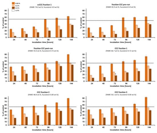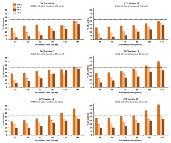 CCC Fractions 9–11 of Fucus vesiculosus, which were richest in fucosterol (59.2 wt.%, 67.0 wt.% and 79.4 wt.%, respectively), showed similarly high percentages of germinated spores after 24–144 h of incubation. For a better comparison, the result after 24 h was used, which usually displays the strongest effect (at longer incubation times, Fusarium is usually defending itself which leads to a higher percentage of geminates spores at longer incubation time). Specifically, this was 4–43% (CCC Fraction 9), 5–41% (CCC Fraction 10), and 4–39% (CCC Fraction 11) at the fraction concentration of 0.5%.
