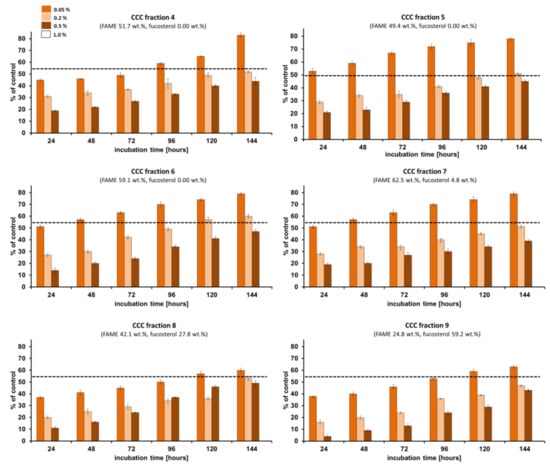 On the basis of the obtained results, it may be concluded that a better effect in limiting the growth of fungus was observed when the CCC fraction was characterized by the high content of fatty acids (over 70 wt.%) or when the CCC fraction contained the mixture of fatty acids and fucosterol.