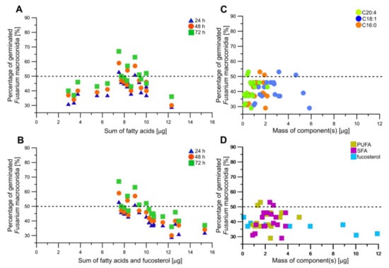 The influence of particular component(s) (A,B) on Fusarium culmorum 1913 germination after 24–144 h of incubation ((C,D) after 24 h of incubation).