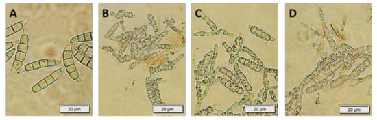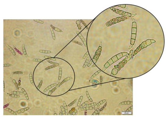 Macroconidia are generally more virulent than microconidia. The morphology of conidia, including their structural integrity, plays a crucial role in the virulence of Fusarium species, thus, any defragmentation or alteration in their structure could potentially reduce their virulence [71]. Successive subculturing of Fusarium oxysporum can lead to degeneration, which affects conidia production and virulence. Degenerated variants showed reduced virulence due to decreased activity of cell wall-degrading enzymes and lower expression of virulence-related genes. This suggests that structural changes in macroconidia, akin to defragmentation, could lead to a similar reduction in virulence [72]. Figure 8 presents Fusarium culmorum 1913 treated with Fucus vesiculosus CCC Fraction 1 (concentration of 1.0%) after 120 h of incubation with visible lysis and internal defragmentation of macroconidia segments as described by Pohl et al. [73].