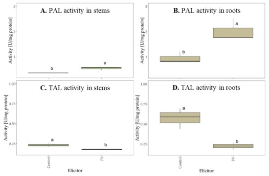 The activity of phenylalanine ammonia-lyase (PAL) and tyrosine ammonia-lyase (TAL) in wheat stems (A,C) and roots (B,D) after seeds inoculation with Fucus vesiculosus scCO2 extract (FV), compared to the water control (Control). The figures show the enzyme activity after 10 days of incubation (bars with different letters are statistically significantly different from each other, p < 0.05). SD was measured in three biological replicates (n = 3).