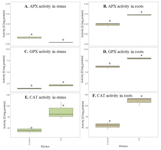 The activity of catalase (CAT), ascorbate (APX), and guaiacol (GPX) peroxidases in wheat stems (A,C,E) and roots (B,D,F) after seed inoculation with Fucus vesiculosus scCO2 extract (FV), compared to the water control (Control). The figures show the enzymes activity after 10 days of incubation (bars with different letters are statistically significantly different from each other, p < 0.05). SD was measured in three biological replicates (n = 3).