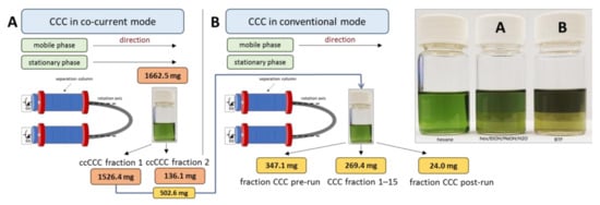 Schematic presentation of the two-step CCC separation ((A)—co-current mode (n-hexane/EtOH/MeOH/H2O); (B)—conventional mode (BTF)) and Fucus vesiculosus scCO2 extract in different solvent systems (BTF—benzotrifluoride; hex—n-hexane; EtOH—ethanol; MeOH—methanol; H2O—water) (on the right).