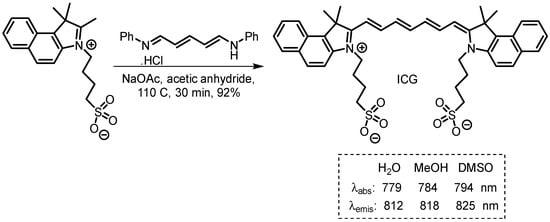 - Fang, X.; Liu, W.; Wu, X.; Zhou, W.; Chen, J.; Liu, X.; Xu, Z. One-step condensation synthesis and characterizations of indocyanine green. Results Chem. 2021, 3, 100092. [Google Scholar] [CrossRef]
