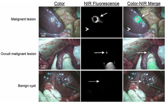 - van der Vorst, J.R.; Schaafsma, B.E.; Hutteman, M.; Verbeek, F.P.; Liefers, G.J.; Hartgrink, H.H.; Smit, V.T.; Lowik, C.W.; van de Velde, C.J.; Frangioni, J.V.; et al. Near-infrared fluorescence-guided resection of colorectal liver metastases. Cancer 2013, 119, 3411–3418. [Google Scholar] [CrossRef]