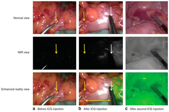 - Ris, F.; Liot, E.; Buchs, N.C.; Kraus, R.; Ismael, G.; Belfontali, V.; Douissard, J.; Cunningham, C.; Lindsey, I.; Guy, R.; et al. Multicentre phase II trial of near-infrared imaging in elective colorectal surgery. Br. J. Surg. 2018, 105, 1359–1367. [Google Scholar] [CrossRef]