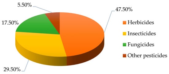 The global agricultural sector suffers from damage inflicted by 8000 weed species, with these losses equating to 13% of the entire crop harvest. Herbicides play a crucial role in safeguarding crops against weeds and ensuring robust agricultural yields, representing the predominant portion of pesticide usage worldwide [15], which stands at 47.5% (Figure 1).