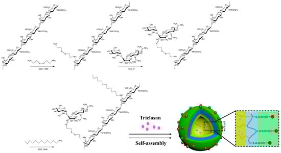 We loaded TCS into the HASS nanomicelles according to the method described in the literature [34]. We dissolved 10 mg of TCS in DMSO in advance to prepare a storage solution of 10 mg/mL. In a round-bottom flask, 30 mg of empty HASS nanomicelles were mixed with 10 mL of deionized water. A total of 300 µL of TCS was gradually added drop by drop to the solution of empty HASS nanomicelles, followed by uniform stirring for 12 h to facilitate the encapsulation of TCS within the carrier. Deionized water was dialyzed for 24 h to remove unencapsulated TCS and DMSO. The dialysis product was freeze-dried, and the sample at this time was the HASS-TCS nanomicelles loaded with TCS. The drug-loaded nanomicelles were sealed and stored in a refrigerator at 253 K for the subsequent experiments.