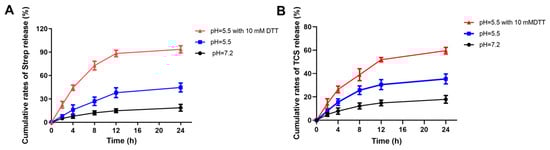At 12 h, 37.95% of streptomycin was released into an acidic medium with a pH of 5.5, while only 14.8% was effectively released from a neutral medium at pH 7.2. This significant difference is primarily due to the increased susceptibility of pH-sensitive hydrazone bonds to cleavage in acidic environments, leading to a substantial release of streptomycin into the medium. In our in vitro release experiments, we observed that the release of streptomycin stabilized at approximately 44.65% after 24 h. This phenomenon may result from the random grafting of cystine/Strep or deciamine onto hyaluronic acid, which allows the side chains to be distributed in both the internal and external regions of the nanomicelles. Furthermore, streptomycin may play a supportive role in the structure of the nanomicelles, consistent with the observed release of streptomycin in TCS (Figure 4) [24]. We simulated the production of H2S during the growth of Salmonella Typhimurium by adding DDT to the release medium. Upon analyzing the release medium, we found that the release of streptomycin and TCS in a buffer with pH 5.5 containing 10 mM DDT reached 93.15% and 59.58%, respectively, after 24 h. Notably, these release levels were significantly higher than those observed in the acidic medium at pH 5.5, indicating that the HASS-TCS materials exhibit dual responsiveness to pH and H2S.