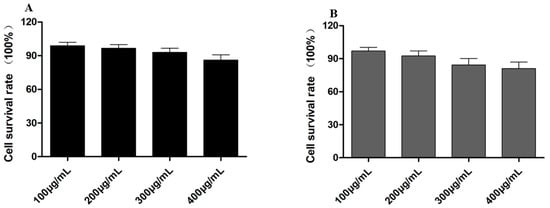 The MTT experiment was implemented to evaluate the cytotoxicity of the empty HASS nanomicelles and HASS-TCS nanomicelles loaded with TCS at concentrations between 100 μg/mL and 400 μg/mL. As illustrated in Figure 5, the results indicate that after co-incubation with RAW264.7 cells for 48 h, both the empty HASS nanomicelles and drug-loaded HASS-TCS nanomicelles exhibited a cell survival rate of approximately 90%, suggesting low cytotoxicity. Notably, the survival rate of the processed cells through the HASS nanomicelles loaded with TCS at a concentration of 300 μg/mL was lower than that of the control cells treated with the empty vector. This decrease may be attributed to the higher concentration of TCS in the nanomicelles, which results in the increased release of both TCS and streptomycin over the 48 h period, thereby affecting cell survival and demonstrating cytotoxic effects. Based on these findings, a concentration of 200 μg/mL was selected for all the subsequent experiments to evaluate intracellular activity.