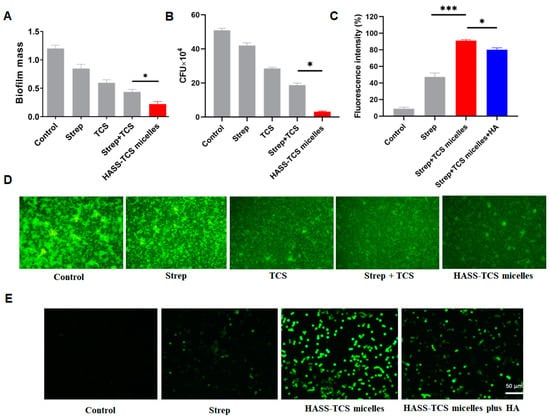 Functional assessment of the HASS-TCS nanomicelles: (A) Efficacy of the HASS-TCS nanomicelles in biofilm clearance. (B) The capability of HASS-TCS nanomicelles to eradicate intracellular bacteria. (C) Changes in fluorescence intensity within cells post-blockade of the CD44 receptor with hyaluronic acid (HA). (D) Fluorescence microscopy image demonstrating the disruption of Salmonella Typhimurium biofilms by the HASS-TCS nanomicelles. (E) Fluorescence microscopy images displaying the intracellular content of Salmonella Typhimurium. RAW264.7 cells infected with Salmonella Typhimurium were treated with HASS-TCS nanomicelles containing 8.7% streptomycin (Strep) and 13.2% triclosan (TCS), as well as equal concentrations of TCS, Strep, and their combination (Strep + TCS). Treatment was conducted at a micelle concentration of 200 µg/mL for 24 h. The presented data are averages from three independent experiments. “*” indicates (p < 0.05); “***” indicates (p < 0.001).