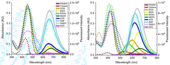 UV-vis (dotted line) and fluorescence (solid lines) of hydroxy chalcone 1 (left) and methoxy chalcone 2 (right) in various solvents at room temperature.