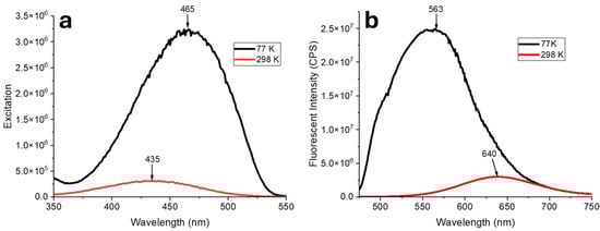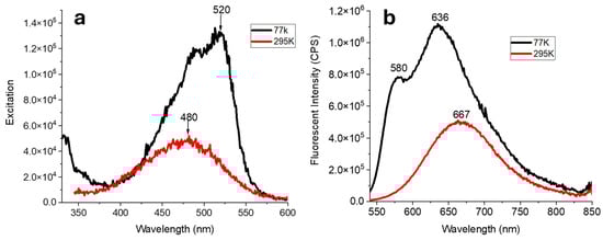 Chalcone 3 was subjected to the same experimental conditions as 2 and the low-temperature fluorescence results are shown in Figure 3. The excitation spectrum of 3 changed similarly compared to chalcone 2, with a spectral red shift of ~30 nm upon freezing. The fluorescence intensity of 3 was increased by a factor of ~10 at 77 K, which was notably higher than that of 2. It should be noted that the A-ring in 3 can rotate with ease at 295 K, which provides an additional non-radiative decay pathway, in comparison with 2 that has a H-bond. This motion was restricted at 77 K, which led to the higher fluorescence response of 3 at the low temperature.