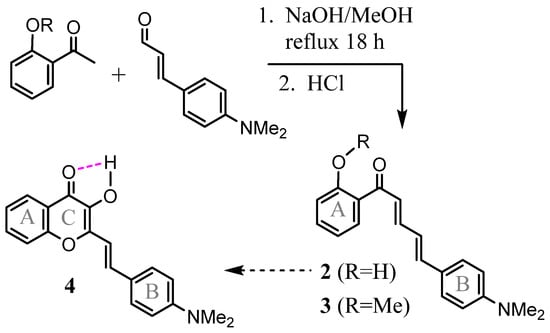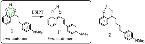 As a class of natural organic compounds found in plants, chalcones have a general structure of Ar–CO–CH=CH–Ar’, making them useful precursors for the synthesis of flavonoids. This class of compounds also exhibit attractive optical properties for different applications. For example, 2′-hydroxychalcone 1 and its derivatives are known to give emission with a large Stokes’ shift (e.g., λabs ≈ 430 nm, λem ≈ 620 nm in benzene) [1]. A notable feature of 1 is that the phenol group on the A ring can form the intramolecular hydrogen bonding (Scheme 1), which can undergo excited state intramolecular proton transfer (ESIPT) upon irradiation [2,3]. In addition, chalcone 1 also includes an amine group (NMe2) as an electron donor and a carbonyl group as an acceptor, enabling the intramolecular charge transfer (ICT). Coupling of ESIPT with ICT has led to various applications of 1, including the design of molecular probes for biothiols [4,5], selective detection of human serum albumin (HSA) [6], detection of Al3+ and Cu2+ Ions [7,8], and solid state near-infrared (NIR) emissive materials [9].