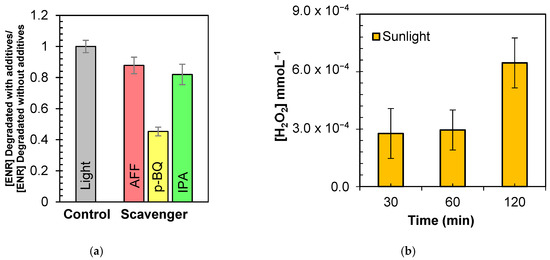 To confirm the role of O2•− and 1O2, aired solutions of ENR in the presence of scavengers were created. Para-benzoquinone (p-BQ) was used for O2●− trapping (kO2●−/p-BQ ~ 1.0 × 109 L mol−1 s−1) [111]; furfuryl alcohol (AFF) was used to quench singlet oxygen (k1O2/AFF = 1.0–1.2 × 108 L mol−1 s−1); and the participation of holes was determined using potassium iodide (KI) [112]. As can be seen in Figure 4a, the degradation rates demonstrate the following order: without additives ≈ KI > AFF > p-BQ. This order suggests the participation of O2●− > 1O2 >> h+ during ENR photodegradation. It should be mentioned that at a pH above 4.8, O2●− could be transformed in its conjugate base, a hydroperoxyl radical (HO2●) (Equation (18)), which can evolve to H2O2 (Equations (19) and (20)) [113,114,115]. Thus, H2O2 presence was confirmed (Figure 4b). Although the degrading impact of hydrogen peroxide on ENR was minimal, as shown in Figure 2c, the UVB energy from sunlight (Equation (2)) and radical reactions could potentially facilitate the generation of HO● (Equations (21) and (22)). A test with an isopropanol (IPA) scavenger for HO● (IPA, k HO●/IPA = 1.9 × 109 L mol−1 s−1) was also performed, and as can be seen in Figure 4a, the results suggest its participation in ENR degradation [116].