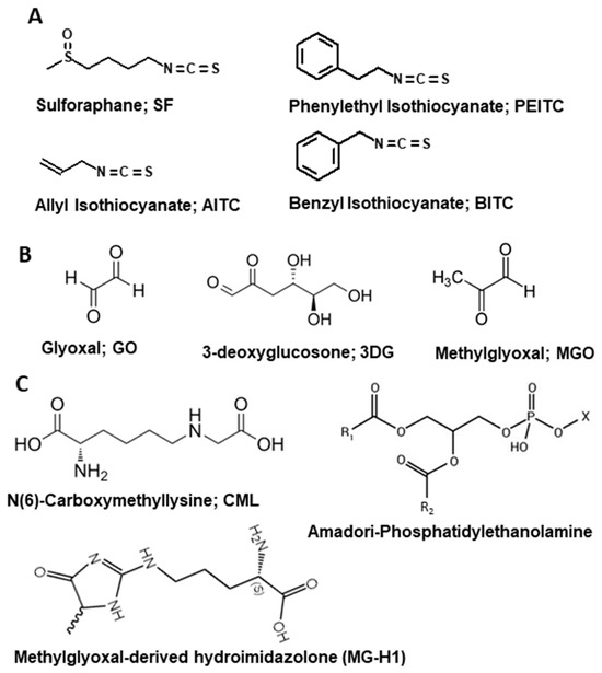 Chemical structures of relevant ITCs (A), reactive carbonyls (B), and AGE adducts (C).