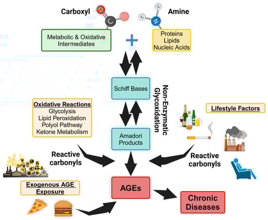 - Prasad, C.; Davis, K.E.; Imrhan, V.; Juma, S.; Vijayagopal, P. Advanced Glycation End Products and Risks for Chronic Diseases: Intervening Through Lifestyle Modification. Am. J. Lifestyle Med. 2019, 13, 384–404. [Google Scholar] [CrossRef]