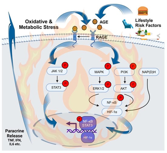 Mechanistically, AGE substrates serve as high-affinity ligands to RAGE, a pattern recognition receptor and a member of the immunoglobulin superfamily [7,68]. RAGE activation by AGE can promote paracrine-mediated oxidative and metabolic stress in multiple cell types and tissues to promote chronic inflammation (Figure 3). Physiologically, while RAGE expression is generally restricted in cells, its expression in immune cells orchestrates the host immune defense [7,68]. When bound by AGE, aberrant RAGE signaling leads to inflammatory phenotypes through the activation of multiple signaling cascades such as phosphatidylinositol-3-kinases and MAPK. This leads to the nuclear activation of master transcriptional regulators including NF-κB, the signal transducer activator of hypoxia-inducible factor 1, and STAT3 (Figure 3) [7,73]. The downstream consequence of aberrant RAGE activation is the increased paracrine release of growth factors, adhesive molecules, and cytokines/chemokines with functional roles in metabolic dysfunction, oxidative stress, and ultimately inflammation [7,68,69,73,77,78].