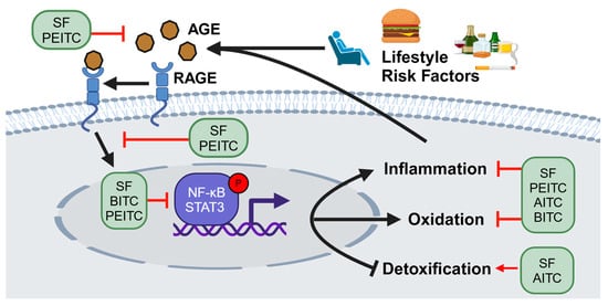 ITCs may influence lifestyle-associated AGE function by inhibiting RAGE binding and downstream effector function to inhibit oxidative and inflammatory pathways while increasing detoxification pathways associated with AGE formation.