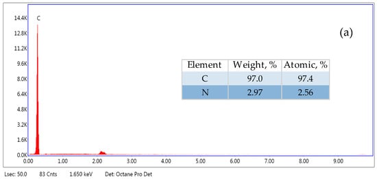 Elemental analysis enabled us to obtain information on the percentage amount of carbon, hydrogen, and oxygen in the original and aged PE-MP. The obtained results of this analysis are presented in Table 2. Each PE-MP contained carbon and hydrogen, and the aged microplastics additionally showed the presence of about 2% oxygen.
