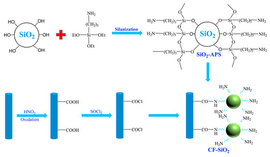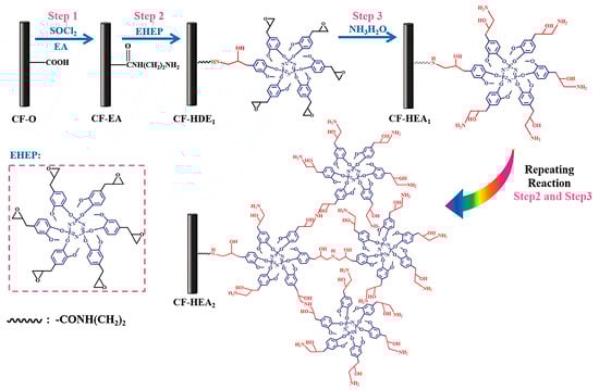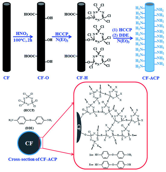 Xu et al. [39] created a highly effective approach for putting reactive amines onto CF surfaces by employing HCCP as a novel coupling agent. The grafting method is presented in Figure 5.