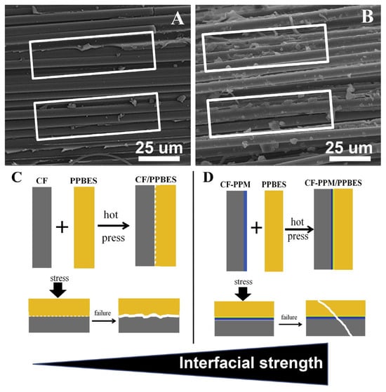 SEM patterns of the ILSS fracture surface and the proposed composite failure mechanism of (A,C) CF/PPBES and (B,D) CF-PPM/PPBES [44]. Copyright 2017 Elsevier.