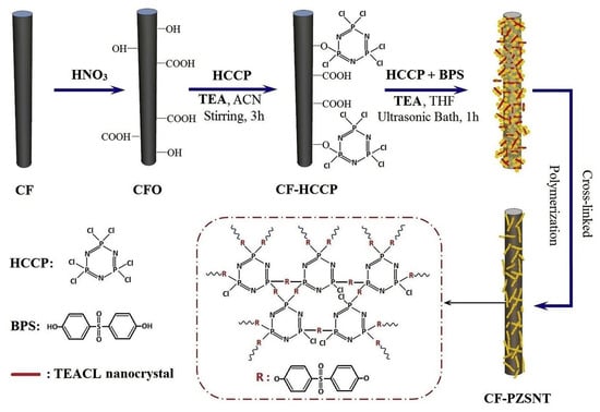 Li et al. [44], employing simple in situ polymerization, prepared an amino-terminated nitrogen-rich layer of poly(cyclotriphosphazene-co-melamine) (PPM) coating to functionalize CF and improve the interfacial adhesion of CF-reinforced PPBES. The grafting method is presented in Figure 3.