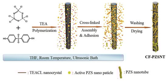 Figure 13 depicts a schematic diagram of the PZSNT/CF manufacturing process using an in situ template method. The most likely mechanism for the formation of PZSNT/CF is the polycondensation of BPS with HCCP via SN under ultrasonic irradiation, which results in the formation of PZS oligomers, primary PZS nanoparticles (NPs), and hydrochloric acid. TEA is used as an acid acceptor to neutralize HCl, forming TEACl and facilitating the polymerization process. Because of its low solubility in THF, TEACl precipitates and forms nanorod-shaped crystals that serve as nano-sized templates. When exposed to TEA, active PZS NPs adhere to the surface of TEACl and cross-link on the template surfaces, resulting in core/shell structures. This process causes PZS NPs to adhere to the surfaces of CF-HCCP fibers, forming a cross-linked PZS coating. Finally, the incorporation of PZS nanotubes into the PZS coating on the CF surface results in hierarchical PZSNT/CF reinforcements.