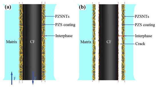 The interphase area of CF-PZSNT/EP composites is shown schematically in two views: (a) before debonding and (b) after [51]. Copyright 2019 Elsevier.