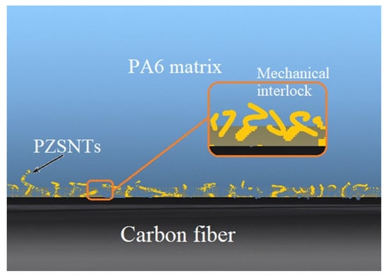 The same group discovered that PZSNTs grown on CFs using a remarkably simple polycondensation method can significantly increase the interfacial adhesion of CF/EP materials (Figure 12) [52]. This study developed PZSNTs/CF hierarchical hybrid improvements using optimization parameters and investigated the effect of CFs alteration on the interfacial interaction of CF-reinforced PA6 (CFs/PA6) materials. The composites’ interfacial property results and interfacial microstructure analysis revealed a significant improvement in IFSS after applying the PZSNTs to the CFs/PA6 composites.