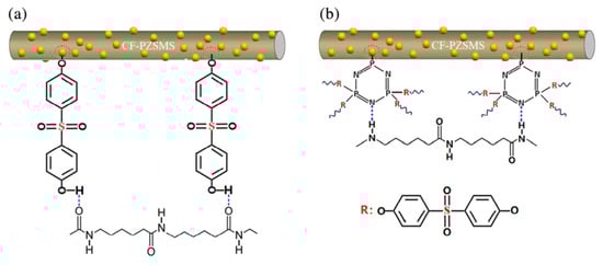 Improved interfacial properties resulted from the PZSMS coating’s increased mechanical interlocking and contact points between the modified CFs and the PA6 resin matrix. Firstly, the greatly enhanced surface energy can result in improved wettability between the PA6 matrix and CF-PZSMS, reducing defects at the composite interface. Secondly, the large number of N=P ring and -OH groups on the surface of PZS multiscale hybrid film modified CF allows for more and stronger H-bonding between the PA6 matrix. Indeed, due to the strong electron (e−) withdrawing characteristic of O=S=O groups, H in -OH groups has a higher electropositivity in BPS molecules. As a result, when compared to -OH groups on the CFO surface, H-bonds can be established more easily between -OH groups on the CF-PZSMS surface and C=O groups in the PA6 matrix (Figure 17a). On the other hand, the N atoms in the N=P ring can provide lone pair e− [57], allowing H-bonds to form between the N=P ring and amide groups in the PA6 matrix (Figure 17b). As a result, in comparison to CFO, more and stronger H-bonds between modified CF and PA6 resin can be generated, hence improving interfacial adhesion significantly. Furthermore, PZSMS can adhere to the PA6 resin and act as an anchor, improving the mechanical interlocking effect and greatly increasing the interfacial shear strength of CFPZSMS/PA6 materials [58].