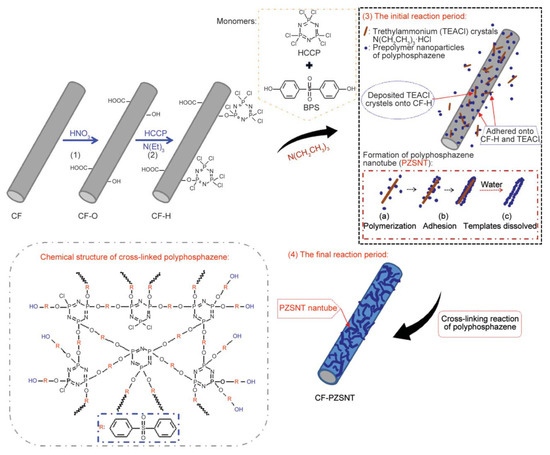 He et al. [45] investigated a simple method for grafting bi-functional groups of terminated branching polyphosphazene (PPZ) onto carbon fibers via direct epoxy resin amine with an aqueous ammonia solution (NH4OH). The technique of the preparation is presented in Figure 19.