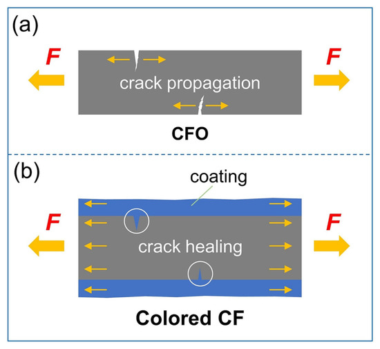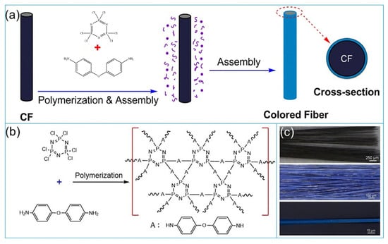 Xu et al. [55] successfully colored CF using thin-film interference by in situ building a layer of poly(cyclotriphosphazene-co-4,4′-oxydianiline) layer on the CF. The technique of the preparation is presented in Figure 21.