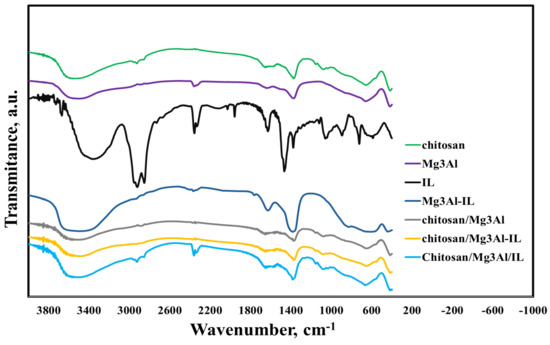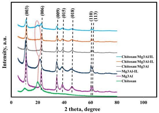 The XRD diffractograms of the synthesized hybrid samples are shown in Figure 1 and are compared with the X-ray diffractograms of the raw materials (chitosan, Mg3Al, Mg3Al-IL).