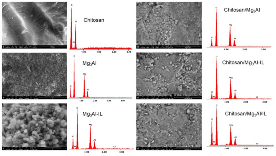 Scanning electron microscopy was used to investigate the surface morphology of the synthesized hybrid materials. SEM images together with EDX spectra are presented in Figure 3. The chitosan particles exhibit a smooth and uniform surface and the Mg3Al sample showcases a hexagonal morphology, organized in overlapping layers as is customary for layered double hydroxides. Upon functionalizing it with methyl trialkyl ammonium chloride through co-synthesis, it is observed that the resulting sample displays a network modification. The layers become disordered because of the ionic liquid permeating between them, giving the surface of the sample that can be associated with cotton flowers. The hybrid samples that were synthesized exhibited varying surface morphologies, showcasing notably rough surfaces with small particles that were uniformly dispersed. The EDX spectra provide compelling evidence for the successful design of hybrid materials. This validation is achieved by observing the distinct peaks corresponding to the specific elements of each component that constitutes the hybrid material. These identifiable peaks indicate the presence and proportion of the various elements, confirming that the intended components have been effectively integrated into the hybrid structure. Thus, the EDX analysis not only supports the synthesis process but also underscores the successful formation of the desired hybrid materials.