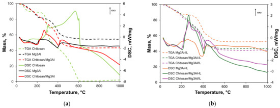 Thermoanalytical curves of: (a) chitosan, Mg3Al and chitosan/Mg3Al; (b) Mg3Al-IL, chitosan/Mg3Al-IL and chitosan/Mg3Al/IL.