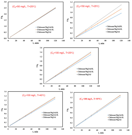Linear representation of the pseudo-second-order kinetic model for palladium adsorption onto the studied materials, using 3 different initial concentrations of Pd solutions (C0 = 50 mg/L, C0 = 100 mg/L, C0 = 150 mg/L) at T = 25 °C and for C0 = 100 mg/L at three temperatures (T = 25 °C, 40 °C and 55 °C).