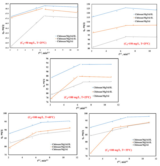 The analysis of the linear dependencies of t/qt as a function of time, as illustrated in Figure 6, indicates a good fit between the pseudo-second-order kinetic model and the experimental data. The correlation coefficients derived from these linear representations are notably close to 1 across all experimental conditions studied. Furthermore, the adsorption capacity values obtained experimentally are in close proximity to those predicted by the pseudo-second-order model. This congruence reinforces the validity of the model, as it suggests that the pseudo-second-order kinetics effectively reflect the actual behavior of the system. The close proximity of experimental and modeled values indicates that the model can reliably predict the amount of palladium that can be adsorbed under various conditions. This finding highlights that the adsorption mechanism may involve significant interactions between the palladium ions and the adsorbent surfaces, potentially including chemisorption processes [31,41]. The highest value for the constant of the pseudo-second order kinetic model, K2, was obtained in the case of chitosan/Mg3Al/IL, suggesting an increased rate of adsorption; in this case, the palladium ions are being rapidly taken up by the adsorbent. This finding suggests an enhanced affinity between the adsorbent material and the palladium ions, reflecting highly efficient interactions at the active sites. Notably, the synthesis method employed—incorporating all three components simultaneously—results in the formation of adsorbent materials with a greater number of active sites. This configuration not only contributes to an increased adsorption capacity but also fosters more robust interactions and a higher rate of adsorption.