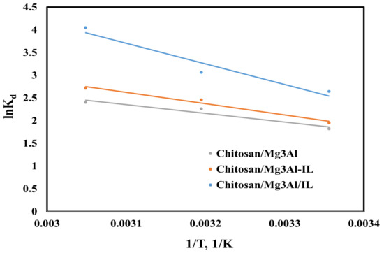 Van’t Hoff’s linearized equation representation of palladium adsorption onto the studied hybrid materials.