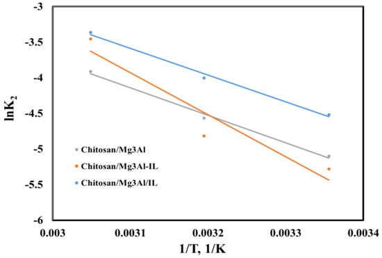 To study the nature of the palladium adsorption process on the studied materials, the thermodynamic parameters (enthalpy, entropy and Gibbs free energy) were calculated [26]. By analyzing the relationship between the equilibrium constant (Kd = qe/Ce) and temperature, and by representing the Van’t Hoff linear plot (Figure 8), the slope allows us to calculate the enthalpy change ΔH0, and the intercept can be used to determine the entropy change ΔS0. The activation energy (Ea) was calculated using the linearized form of the Arrhenius equation (Figure 9) [28].The obtained results are presented in Table 2.