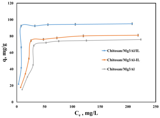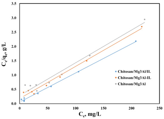 Equilibrium studies convey information on the maximum adsorption capacity and affinity of the materials used as adsorbents with respect to the target compound. Figure 10 presents the equilibrium isotherms for palladium adsorption onto the studied hybrid materials. The adsorption capacity developed by the studied materials increases with rising equilibrium concentration until reaching a constant value, which corresponds to the saturation of the adsorbent surface with palladium ions. Notably, the lowest adsorption capacity was observed for chitosan/Mg3Al at an initial concentration of 200 mg/L. The functionalization of the adsorbents with the studied ionic liquid significantly enhances their adsorptive efficiency, indicating that the functional groups in the ionic liquid play a key role in facilitating the removal of palladium from aqueous solutions. Furthermore, the method of preparing the adsorbent material was found to impact the effectiveness of palladium recovery. Among the materials tested, the chitosan/Mg3Al/IL hybrid exhibited the highest adsorption capacity, suggesting that the ionic liquid functionalization is most beneficial when applied during the hybrid material synthesis, rather than during the LDH synthesis process.