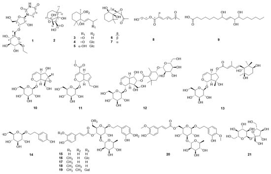 Along with three newly identified compounds, 18 previously known compounds were isolated (Figure 1): dihydroxy-β-ionone (3) [23], rehmaionoside C (4) [23], rehmaionoside A (5) [24], frehmaglutin J (6) [25], frehmaglutin I (7) [25], tianshic acid (9) [26], catalpol (10) [27], geniposide (11) [28], frehmaglutoside G (12) [29], 6-O-sec-hydroxyaeginetoyl ajugol (13) [30], salidroside (14) [20], acteoside (15) [31], jionoside A1 (16) [32], leucosceptoside A (17) [33], martynoside (18) [34], jionoside B1 (19) [32], isomartynoside (20) [35], and sucrose (21) [36]. Compound 9 was found for the first time in the R. glutinosa species.