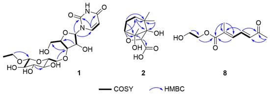 COSY and HMBC key correlations of compounds 1, 2, and 8.