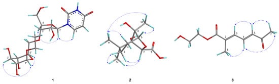 Nuclear Overhauser effect correlations of compounds 1, 2, and 8.
