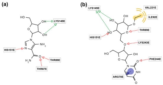 Binding interactions of (a) 5-amino-4-imidazolecarboxamide ribonucleoside (AICAR) and (b) compound 1 with AMP-activated protein kinase (AMPK) in silico docking simulations in Autodock 4.2. Green arrow: hydrogen bond (H-bond) donor; red arrow: H-bond acceptor; yellow interaction: hydrophobic interaction or van der Waals force; blue arrow: aromatic interaction. (ARG, arginine; HIS, histidine; ILE, isoleucine; LYS, lysine; PHE, phenylalanine; THR, threonine; VAL, valine).